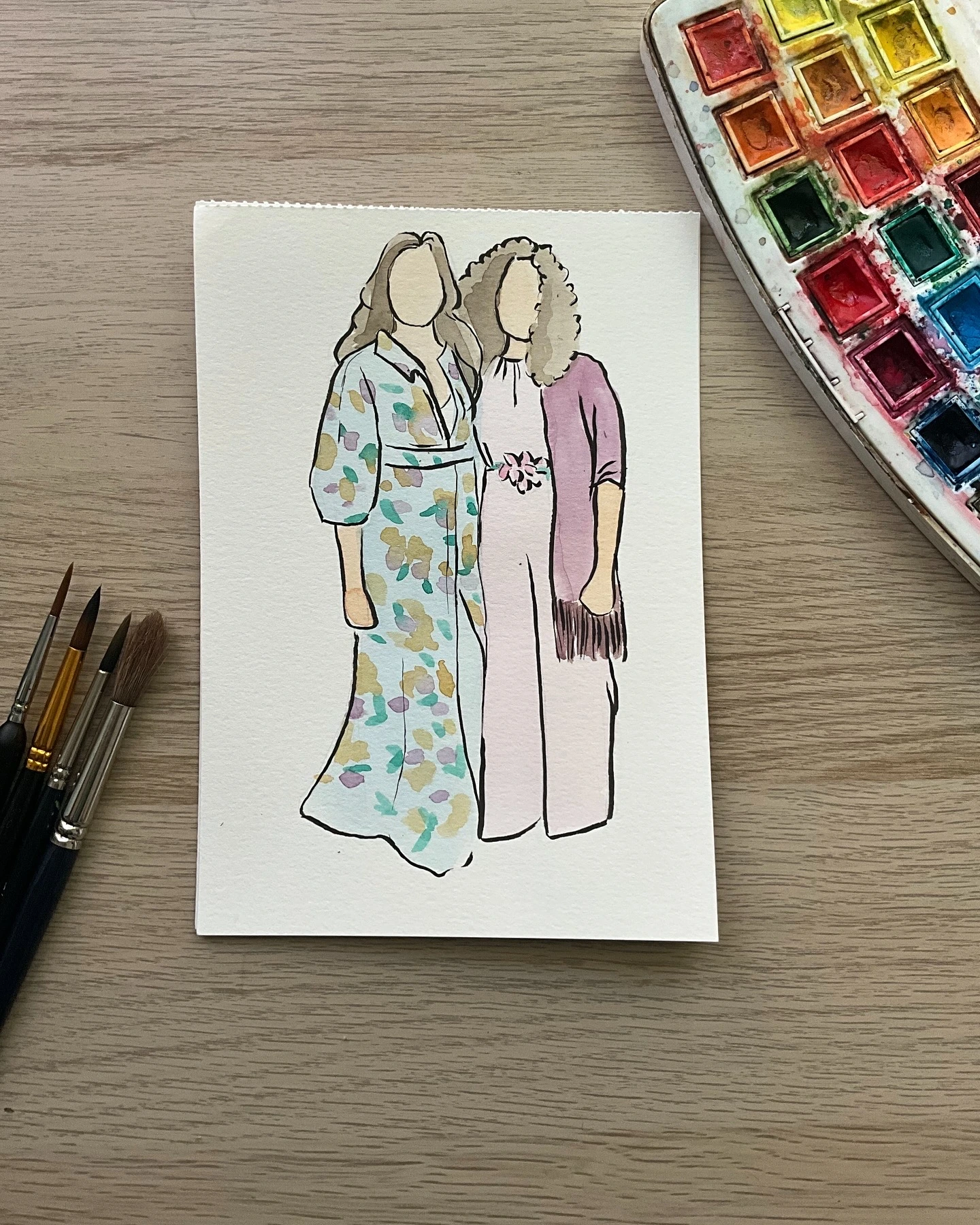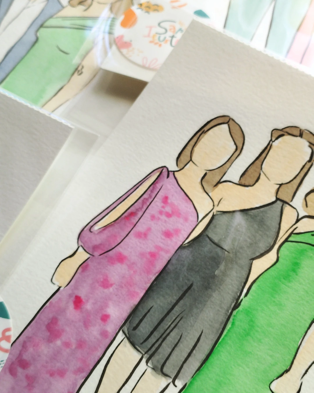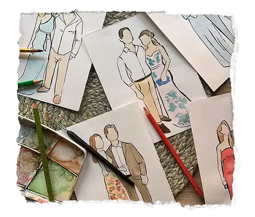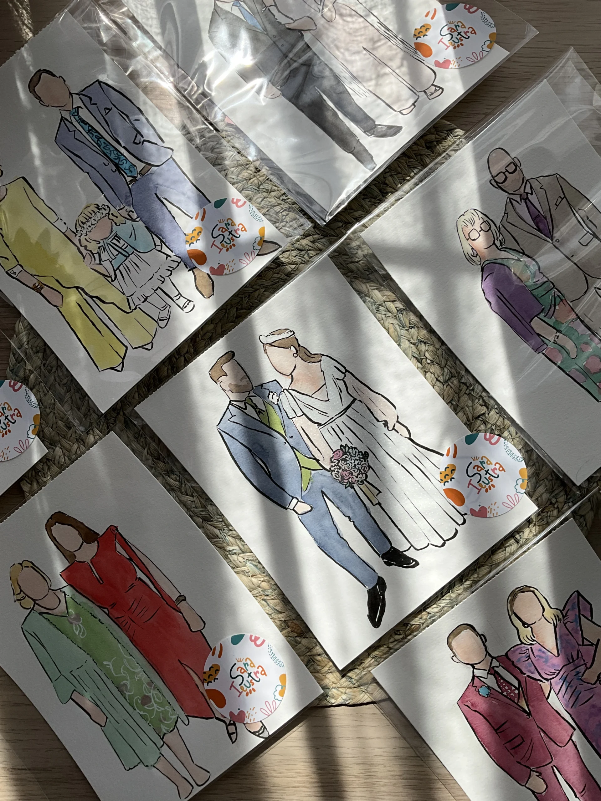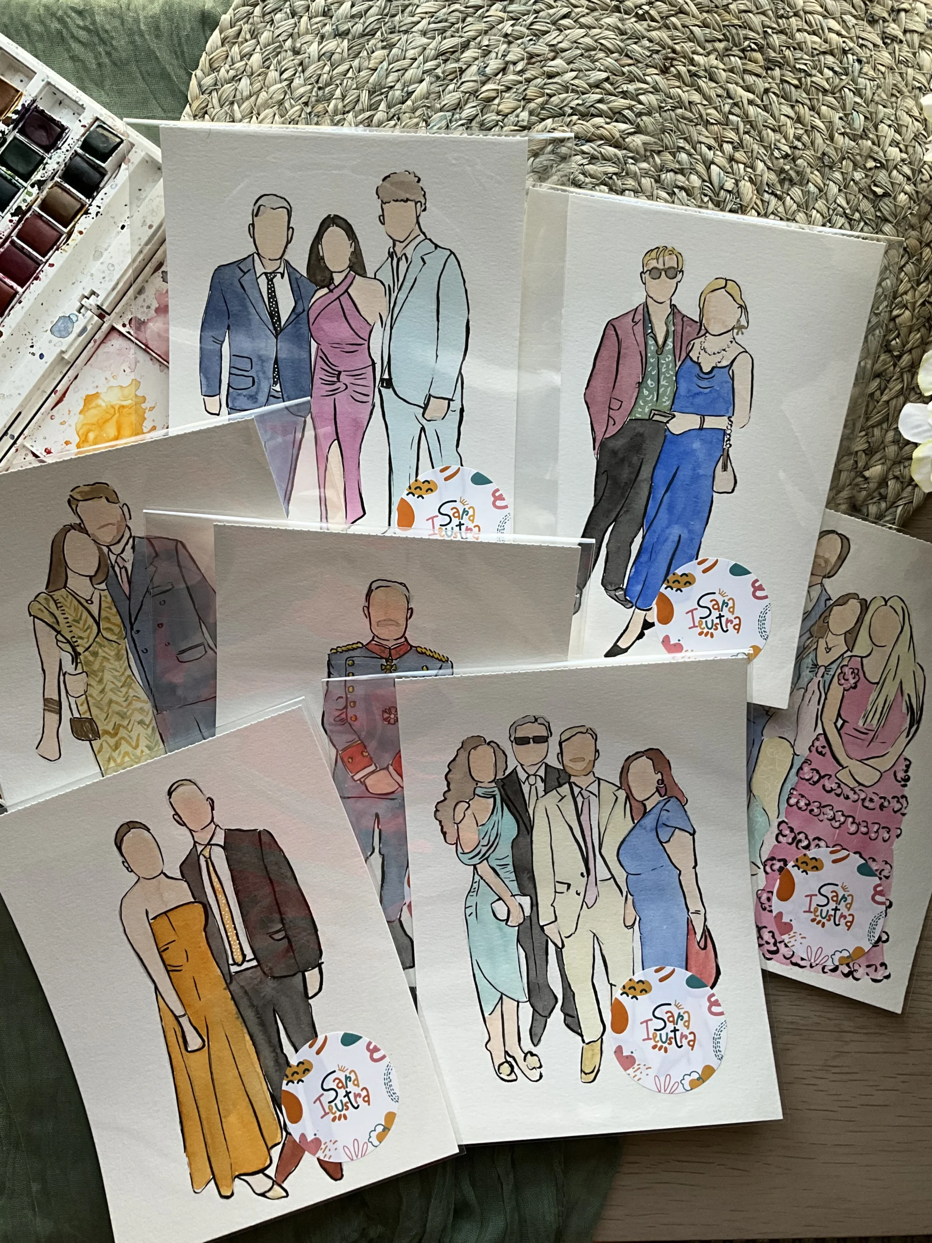 Al principio yo sacaré fotos a todos los invitados que quieran su dibujo e iré pintando mientras tomáis el aperitivo y coméis. Así, los invitados no tienen que estar posando. Iré exponiendo las pinturas que vaya acabando y los invitados pueden ir recogiéndolas junto con un sobre para protegerla. En cada ilustración se suele retratar a una pareja o familia de tres.